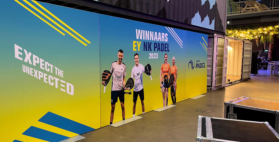 Niks is te gek voor onze Timo! Helemaal in zijn element in zijn klimharnas om 9 meter hoge doeken op te hangen voor het NK Padel in Eindhoven. We hebben daarnaast ook nog 6 oefenbanen en het centercourt voorzien van boarding. De gevel, spelersbanken en een aantal wanden mochten ook niet ontbreken. Ontwerp knalt er in ieder geval flink uit!